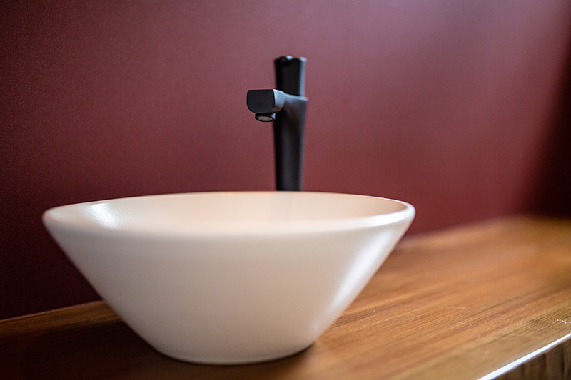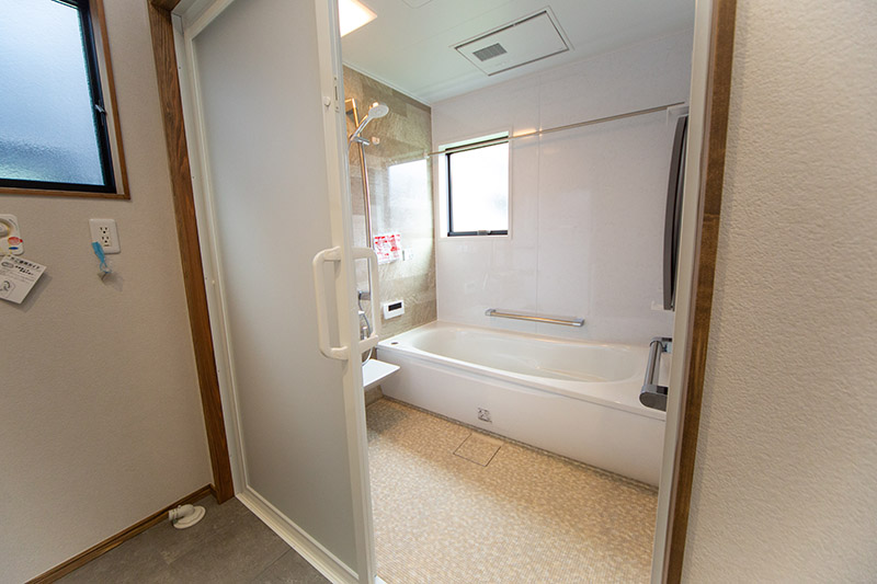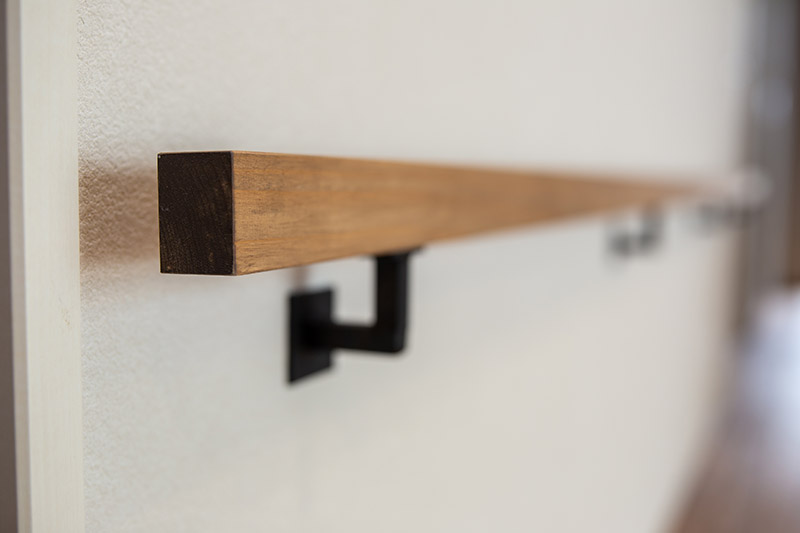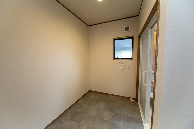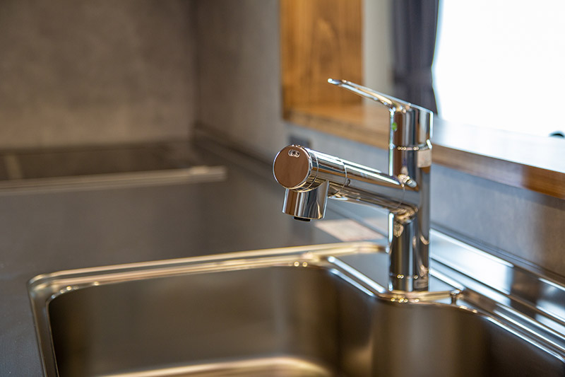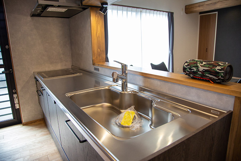 キッチン, 造作洗面, 勾配天井, 外壁塗り壁, 無垢階段, 無垢フロア