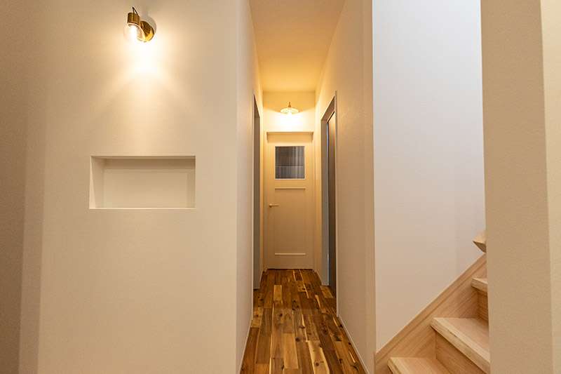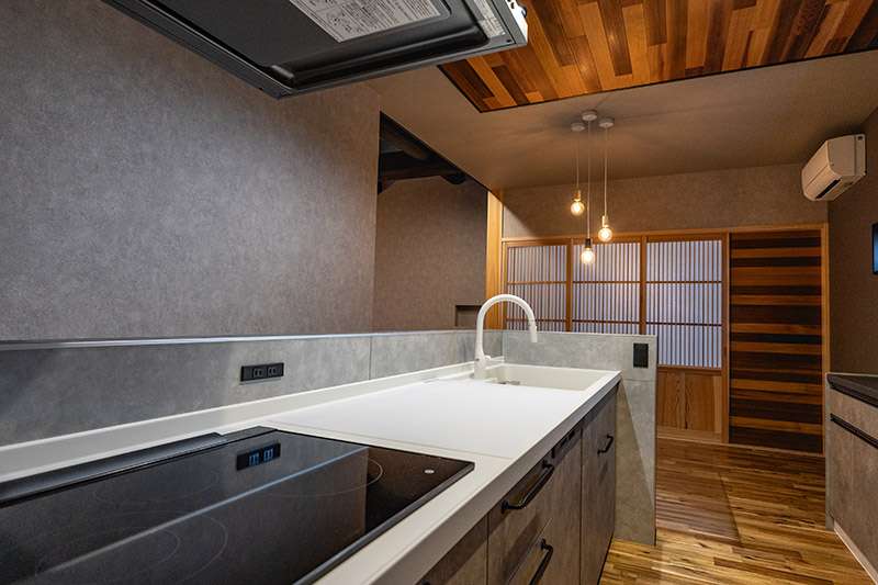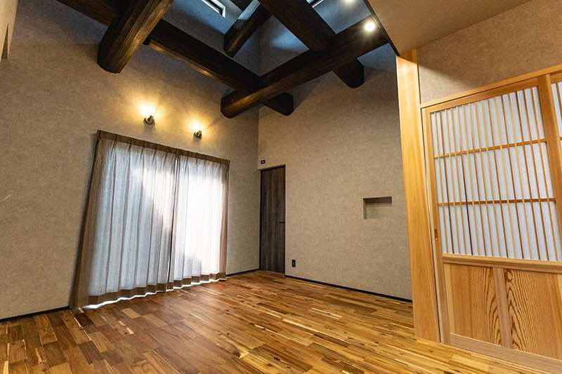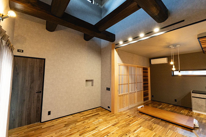 キッチン, 和室/畳コーナー, ウォークインクローゼット, 吹き抜け, 外壁塗り壁, 無垢階段, 無垢フロア, オリジナル建具