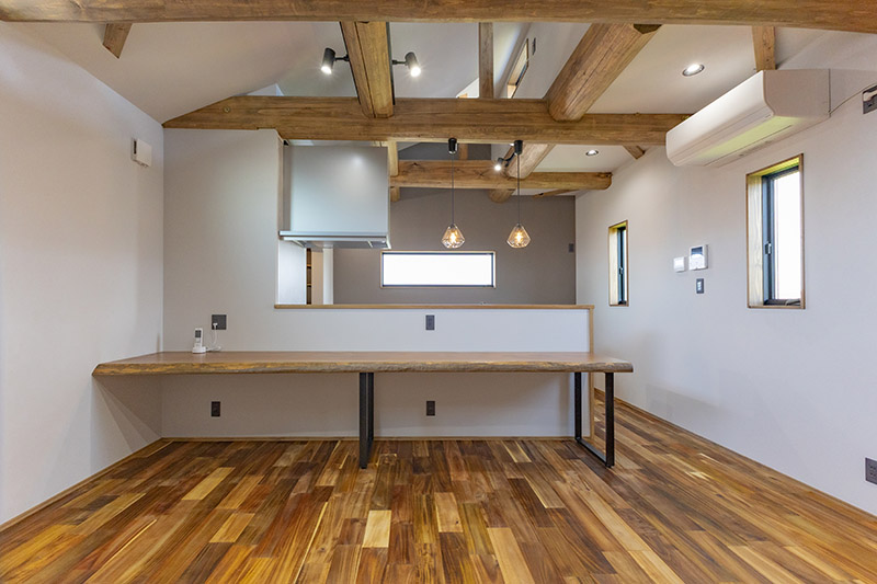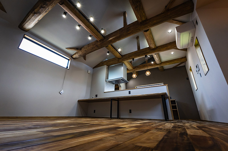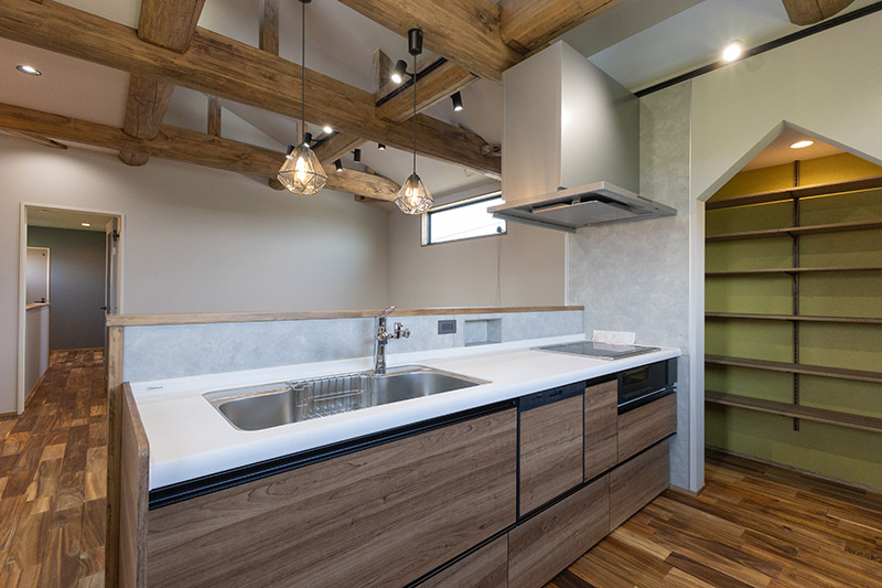 キッチン, 造作洗面, ウォークインクローゼット, 勾配天井, 外壁塗り壁
